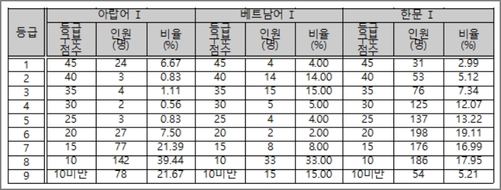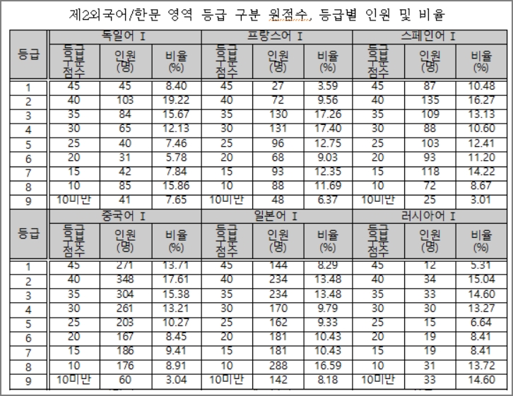 독일어1, 프랑스어1, 스페인어1, 중국어1, 일본어1, 러시아어1, 아랍어1, 베트남어1, 한문1 등급구분점수입니다.