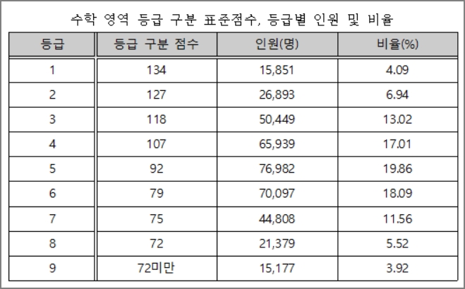 수학 영역 등급 구분 표준점수, 등급별 인원 및 비율입니다. 1등급은 134점, 2등급은 127점, 3등급은 118점, 4등급은 107점, 5등급은 92점, 6등급은 79점, 7등급은 75점, 8등급은 72점, 9등급은 72점 미만입니다.