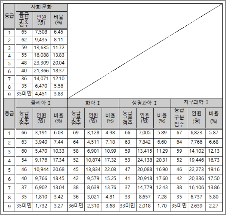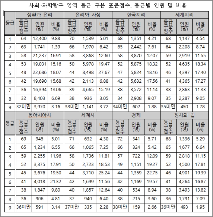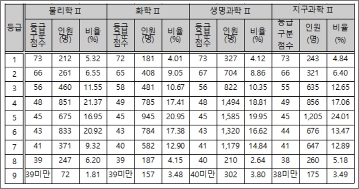 생활과 윤리, 윤리와 사상, 한국지리, 세계지리, 동아시아사, 세계사, 경제, 정치와 법, 사회문화, 물리학1, 화학 1, 생명과학1, 지구과학1, 물리2, 화학2, 생명과학2, 지구과학2 등급컷입니다.