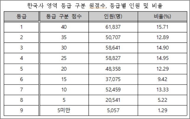 한국사 영역 등급구분 원점수입니다. 1등급은 40점, 2등급은 35점, 3등급은 30점, 4등급은 25점, 5등급은 20점, 6등급은 15점, 7등급은 10점, 8등급은 5점, 9등급은 5점미만입니다.