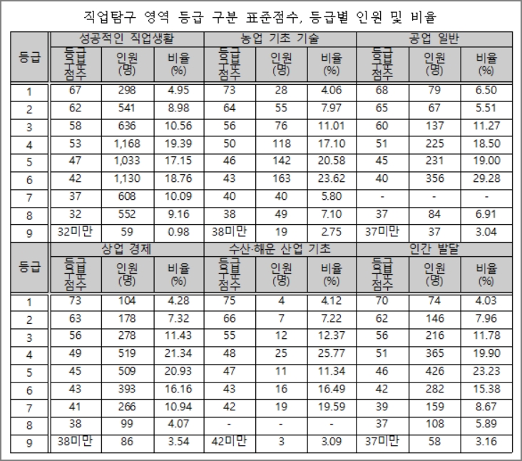 직업탐구 영역 등급 구분 표준점수, 등급별 인원 및 비율입니다. 성공적인 직업생활, 농업 기초 기술, 공업일반, 상업 경제,수산·해운 산업 기초, 인간 발당 등급컷입니다.