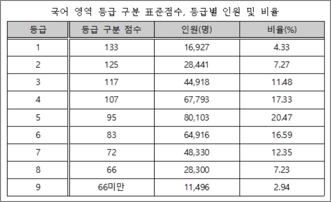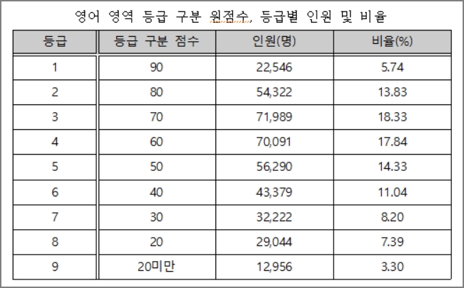 영어 영역 등급 구분 원점수, 등급별 인원 및 비율입니다. 1등급은 90점, 2등급은 80점, 3등급은 70점, 4등급은 60점, 5등급은 50점, 6등급은 40점, 7등급은 30점, 8등급은 20점, 9등급은 20점 미만입니다.